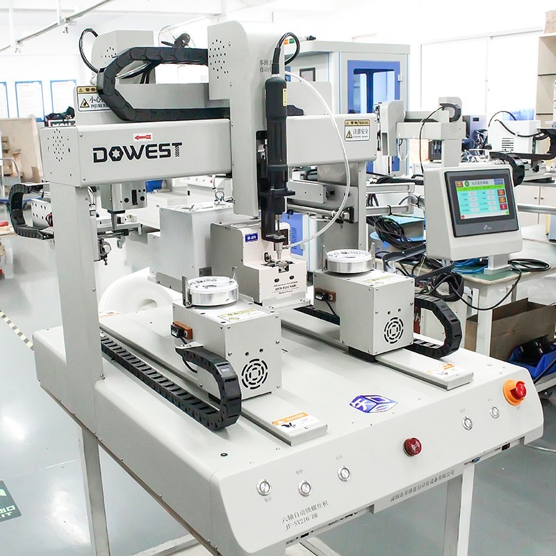 桌面式螺丝机是一种比较常见的标准机型。对于目前很多组装厂逐步导入自动化的过程,是个比较方便和投入较小的设备。这个设备有几大优势:1.通用性强:可根据不同的产品螺丝分布,这只相对应的行程轨迹,便可实施对不同产品的锁付。体积小,可配合产线作业,更换产品方便。2.效率高:两把电批同时工作,可代替多名工人;可一次性锁付多个产品。3.依据机台批头的多少,可以加速打螺丝过程从而提高生产效率。当然这个设备目前也有局限,就是每个供料器只能供应一种螺丝物料,如果更换螺丝,对应电批头也可能要更换。所以使用不同螺丝的不同工位要添加不同的桌面式螺丝机。